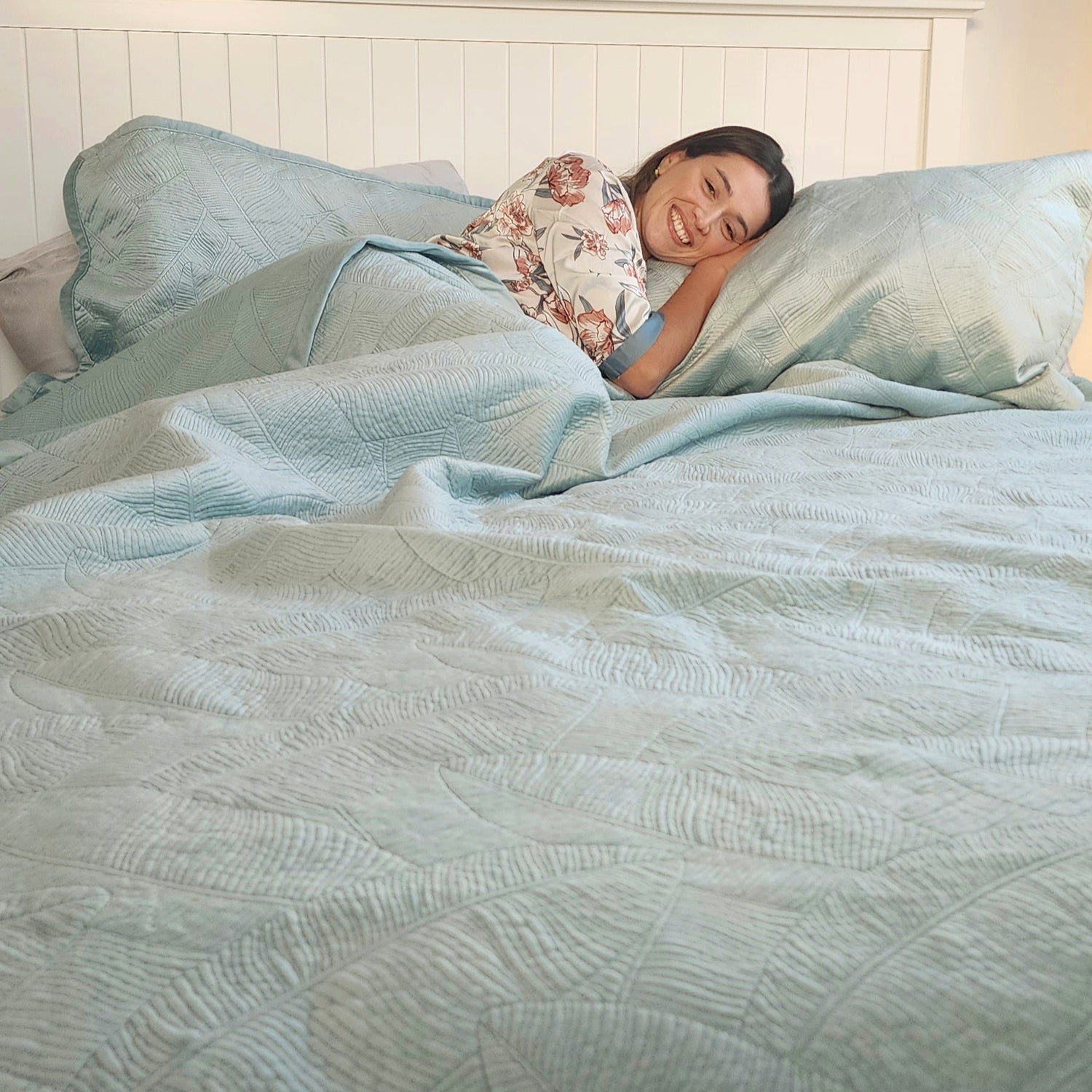 This is the second coverlet I have purchased. Love the colours and feel. I used to dread making my bed, now I love it. So easy to manage a King Size on my own. As I said in previous review Menopause friendly! Won’t sleep with anything else. Early night for me.